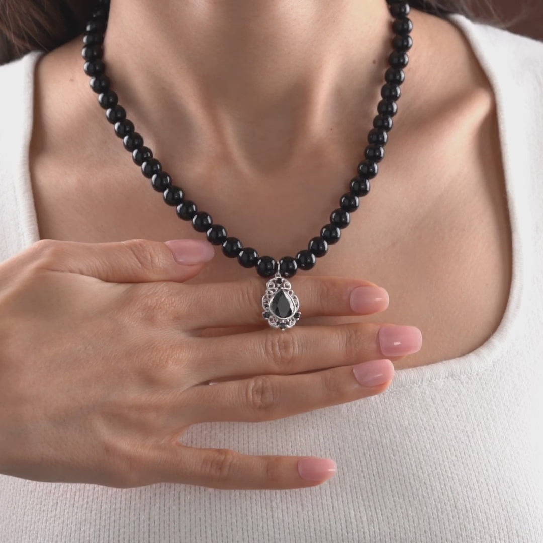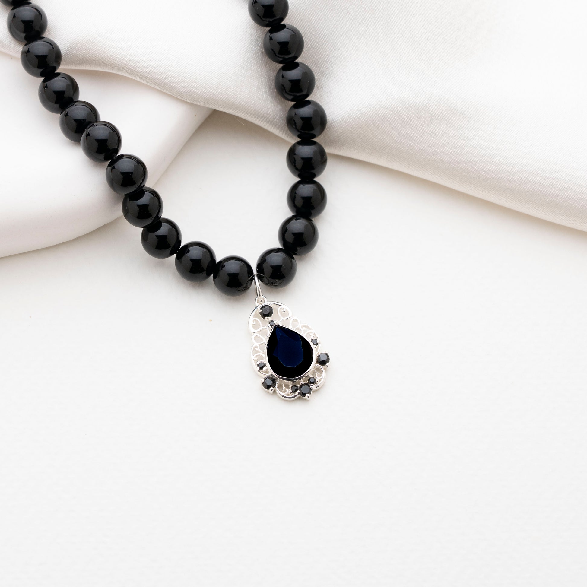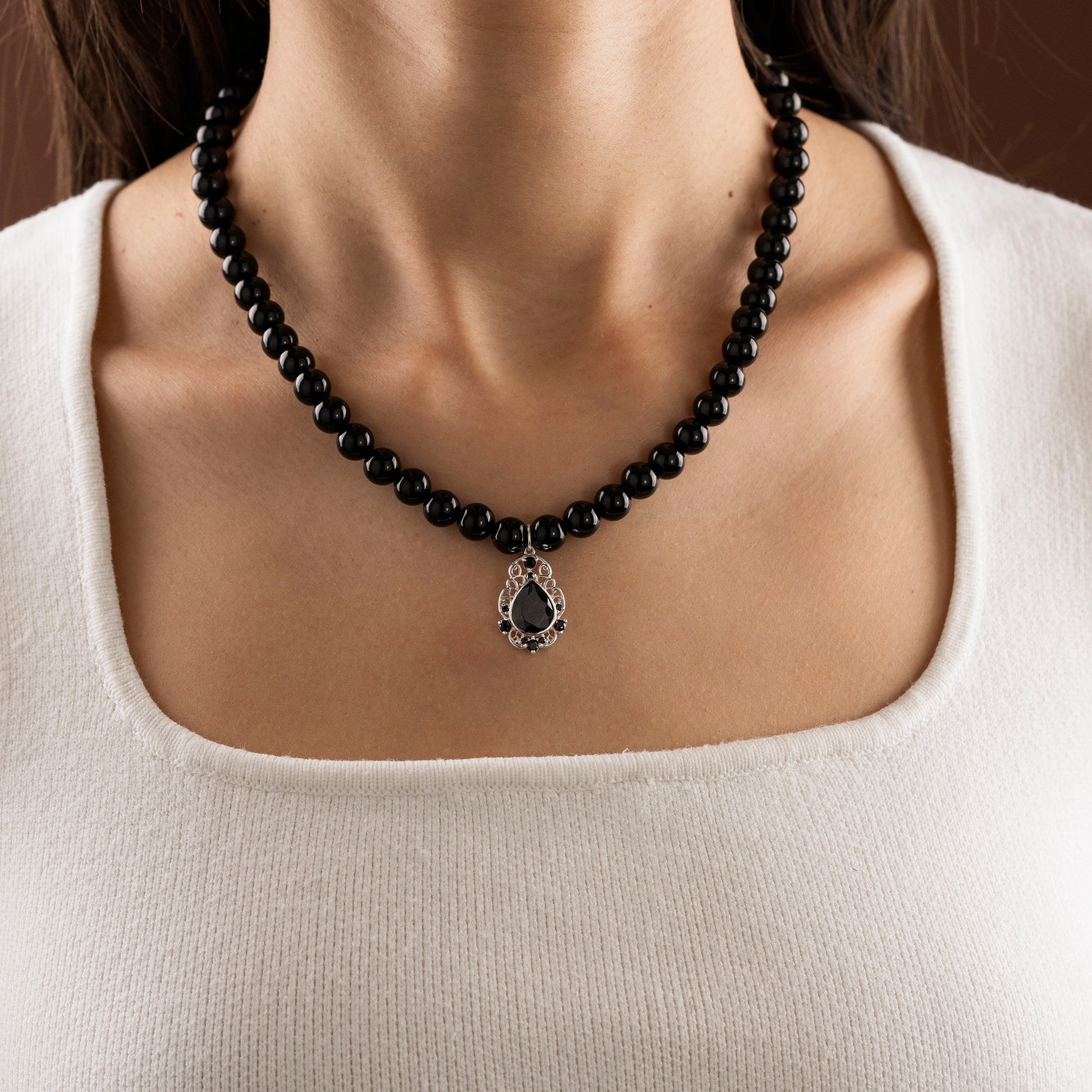 This sophisticated piece is meticulously handcrafted from authentic Onyx gemstones, paired with high-polish 925 Sterling Silver accents. The deep, lustrous black of the natural onyx beads provides a bold contrast to the intricate silver pendant, offering a refined aesthetic that transitions seamlessly from day to evening wear. Designed for those who appreciate the weight and texture of genuine materials, this necklace is a timeless addition to any high-end jewelry collection.