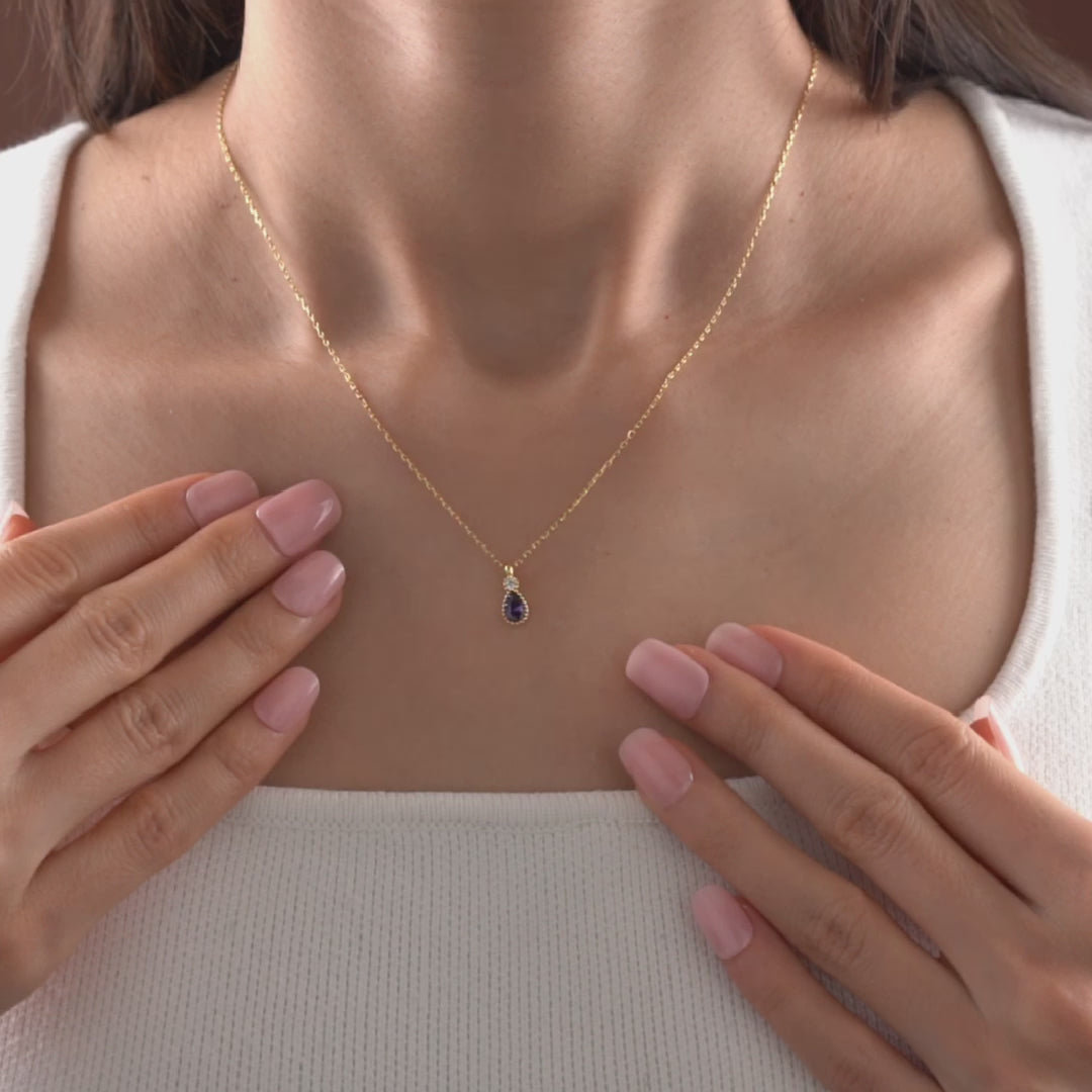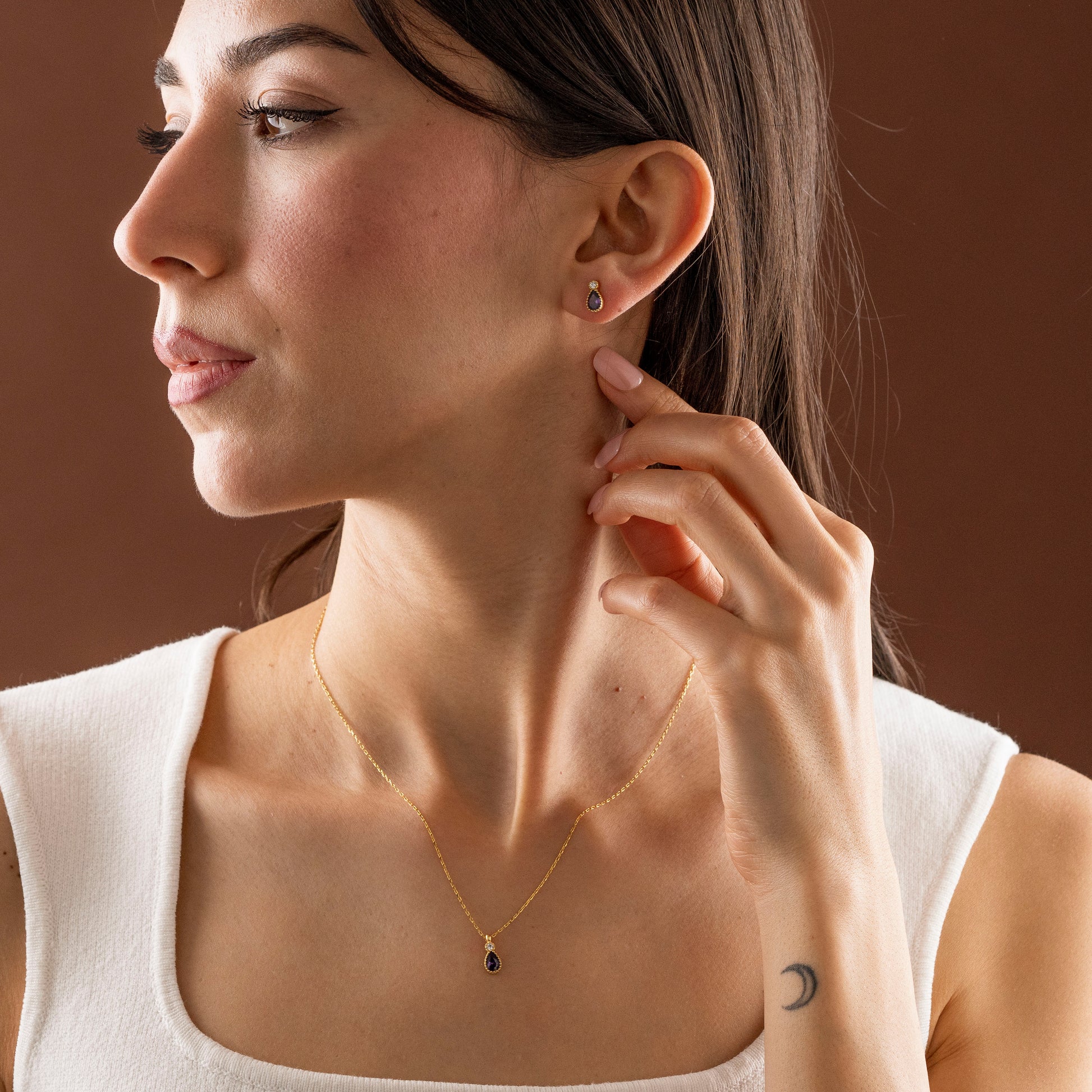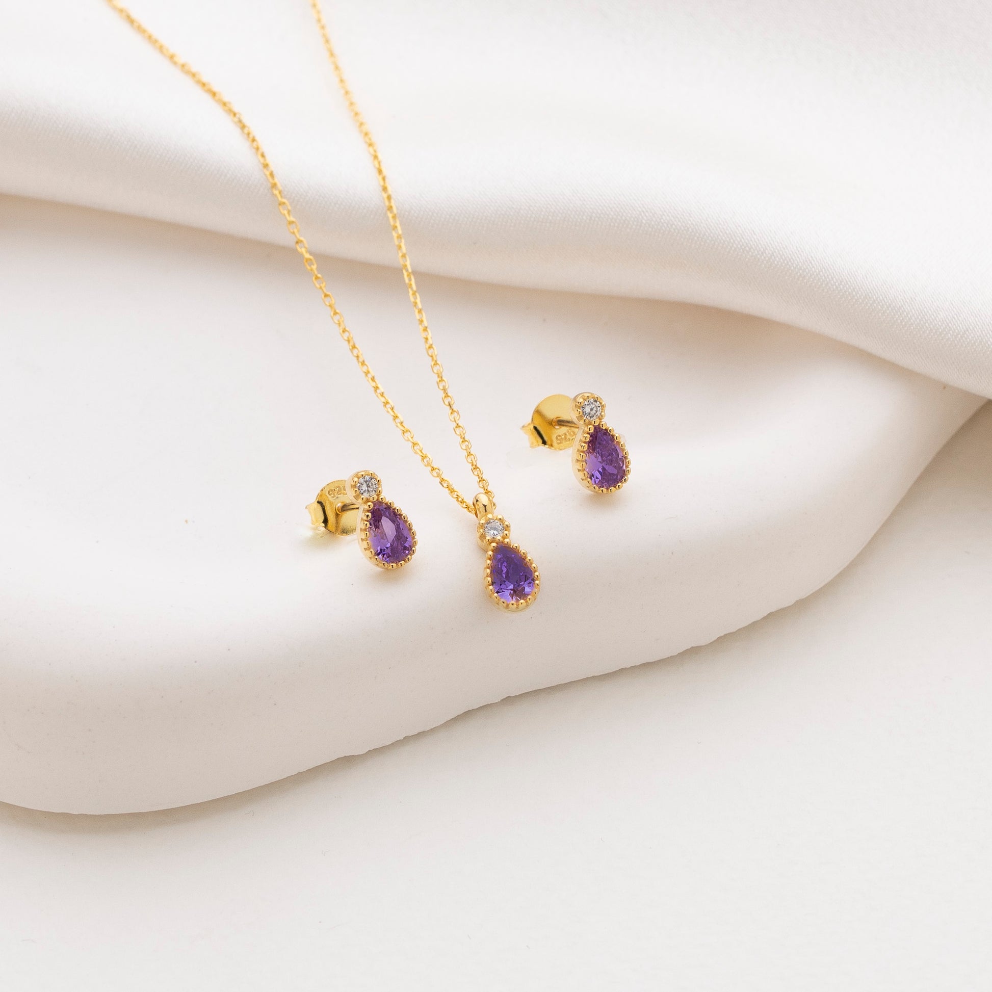 Elevate your style with this stunning matching set, meticulously crafted from 925 Sterling Silver and featuring high-grade, teardrop-cut Amethyst-colored Cubic Zirconia. Available in timeless Shinny Silver, romantic Rose Gold, or classic Gold finishes, this set offers a personalized touch for every look. Choose your perfect fit with adjustable chain lengths ranging from 12 to 24 inches, ensuring a delicate and sophisticated drape.